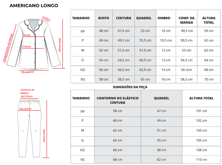 Pijama modelo longo: Blusa manga longa com botões e calça com cós de elástico embutido e detalhe em amarração.